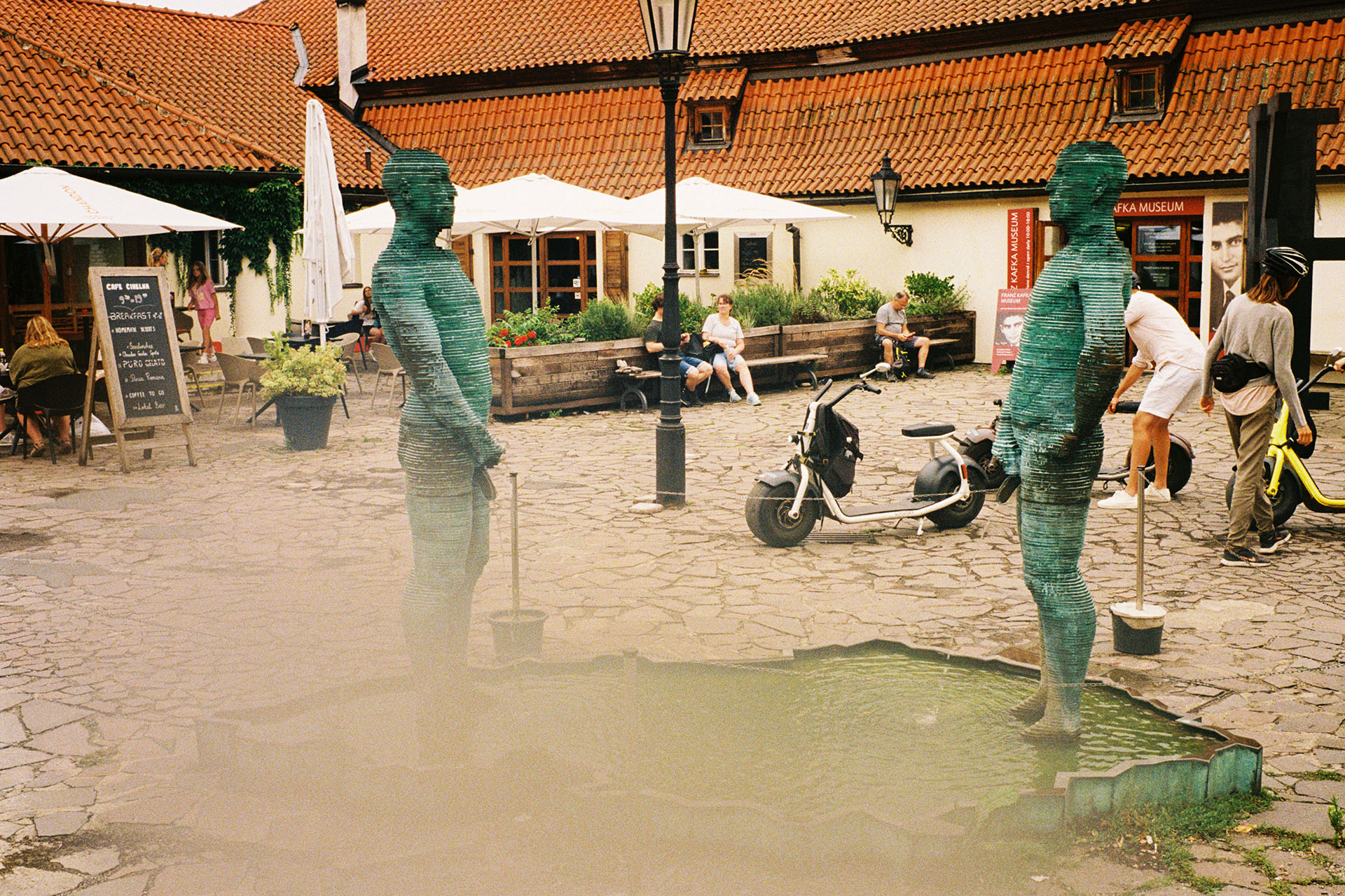 We discovered but did not enter the museum dedicated to Franz Kafka, who was apparently from Prague. Who knew? There was a fantastic statute in the courtyard with two people pissing into a pool shaped like the Czech Republic, but of course the smear on my lens obscured the best bits.